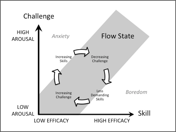 Also, getting and keeping us in a Flow State (a mental state where we're neither bored nor overwhelmed by what we have to do) is crucial to prevent gamers from getting bored or anxious. The following aspects are used in games to achieve these goals: adjust the challenge level, release add-ons and updates, have friend lists, and great visual effects. The image below shows the basic principle of the flow state.