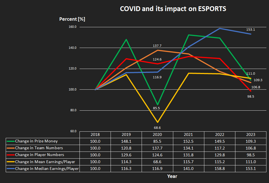 The image below shows the impact of the COVID pandemic on esports, specially tournament prize money, the number of teams, players, as well as the median and mean earnings per player.