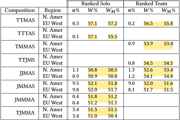The table above shows the results. I comprised the table so it only shows the solo and team ranked matches. On the left side, you can see the team comps that were played: T = Top, J = Jungle, M = Mid, A = ADC, and S = Support. n% is the percentage of teams that played that specific comp. W% is the win percentage, and WM % is the win percentage against the meta comp.