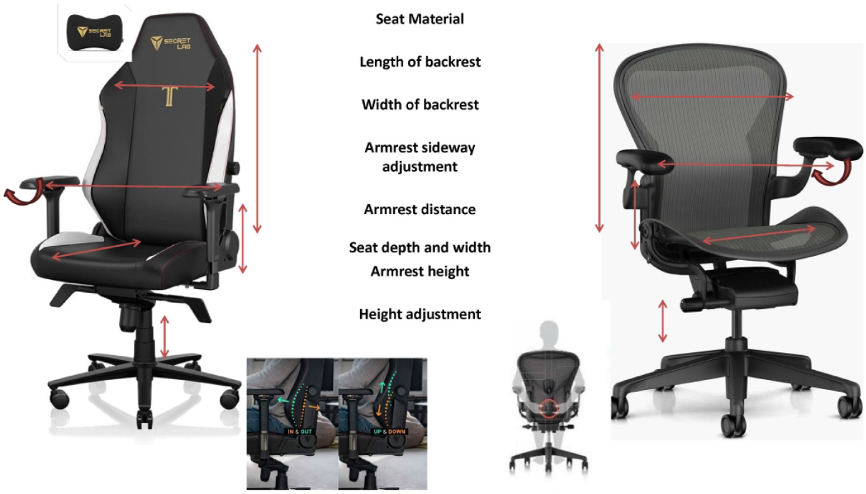 "Gaming and Aeron chairs differ in design, ergonomics, and intended use. Gaming chairs feature... adjustable neck and lumbar pillows, allowing for a more reclined, relaxed posture ideal for extended gaming sessions... [while the] Aeron chairs have... flexible mesh for airflow and support, promoting an upright, active sitting posture suited to office work." [1]