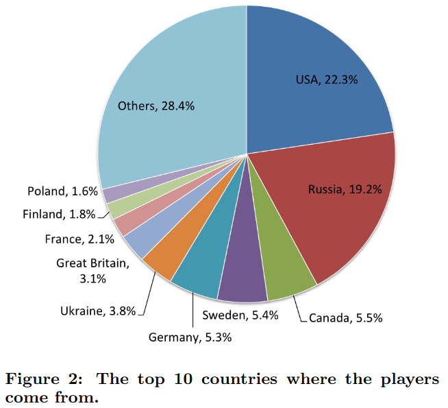 To determine whether team performance goes up or down when teams are more or less diverse, the researchers analyzed 885,228 DotA 2 matches, played by 138,101 players. The data were pulled from Steam. The image below shows the top 10 countries where the players came from. In total, 233 countries were represented. The data, however, are from 2011.