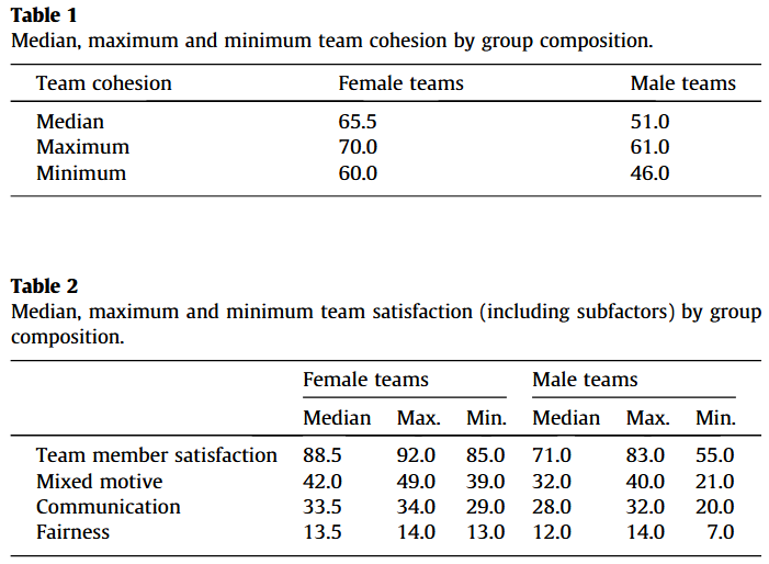 As you can see in the tables above, differences between the female and male teams emerged. All-female teams had higher scores of median team cohesion and satisfaction (across all four subfactors).