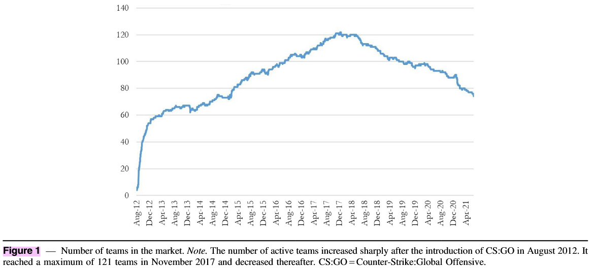 • Until 2018, the number of CS:GO teams increased, then fell.