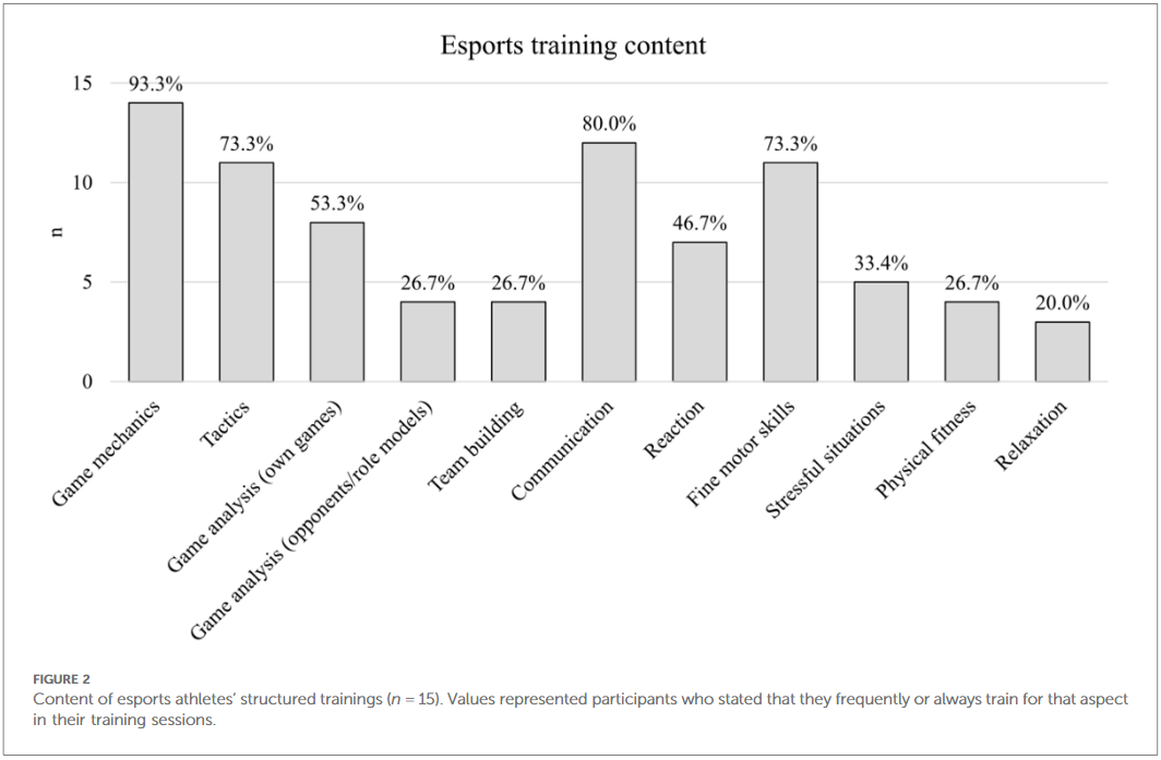 When it comes to training, only 15 out of 32 train on a regular basis (another hint that the sample doesn't really include athletes, but instead recreational gamers—or amateur players at best). However, those who train focus on the following aspects (see the figure below).