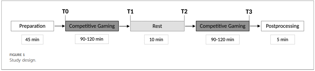 The researchers, therefore, aimed to examine the physical burdens of esports athletes during competitive gameplay. They recruited 32 players (not exactly esports athletes, as the requirement to participate was being in the top 20% of their respective game). However, 59% of them were in the top 5% or higher. The players then underwent the following procedure (see the figure below).