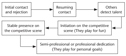 A more nuanced framework displaying the career development of an Esports player comes from Bonilla and his co-authors last year 2022. It shows how players progress from an initial contact with video games to becoming (semi-)professionals. Similar to Salo, players get into games – and later Esports – due to contact with family or friends. If they continue playing