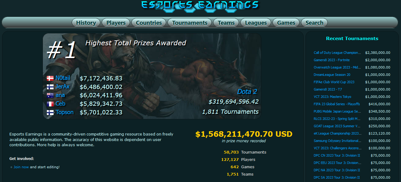 Esports Earnings is a community website that lists winnings from tournaments per player, country, tournament, team, league, and game. The pictures above show general information about prize money from the website, as well as the current top 20 players and countries by prize money won.