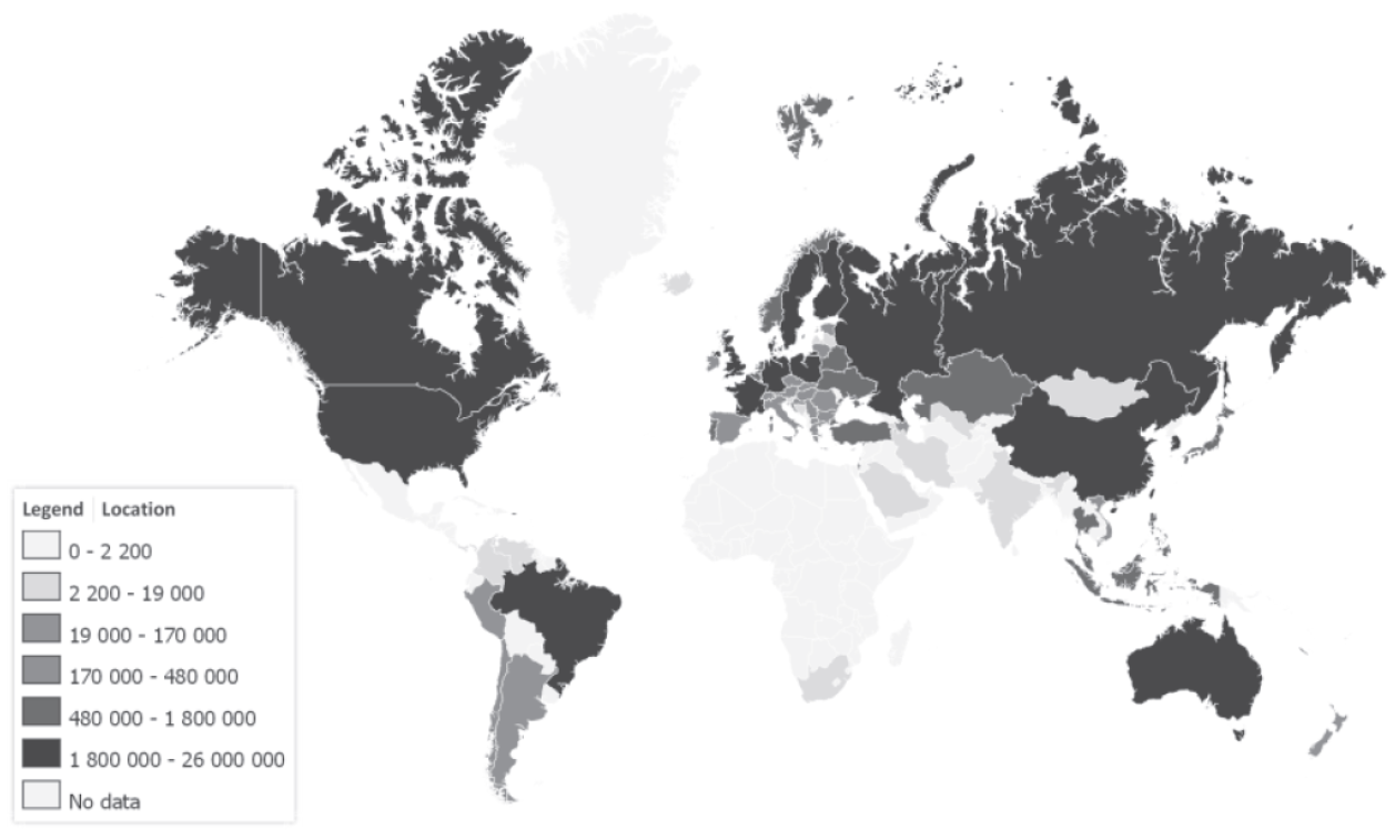 Based on the data from the website (1999 to 2015), the authors visualized the most successful countries. As you can see in the picture below, the parts of the world that have prize money-winning players or teams are Westernized countries, which is not very surprising. The range of prize money goes from 0 to 26 million US Dollars. The top five successful countries were the US, Brazil, Sweden, South Korea, and China. If you compare it with today's data, China has become the number one, followed by the US, South Korea, Russia, and Denmark.