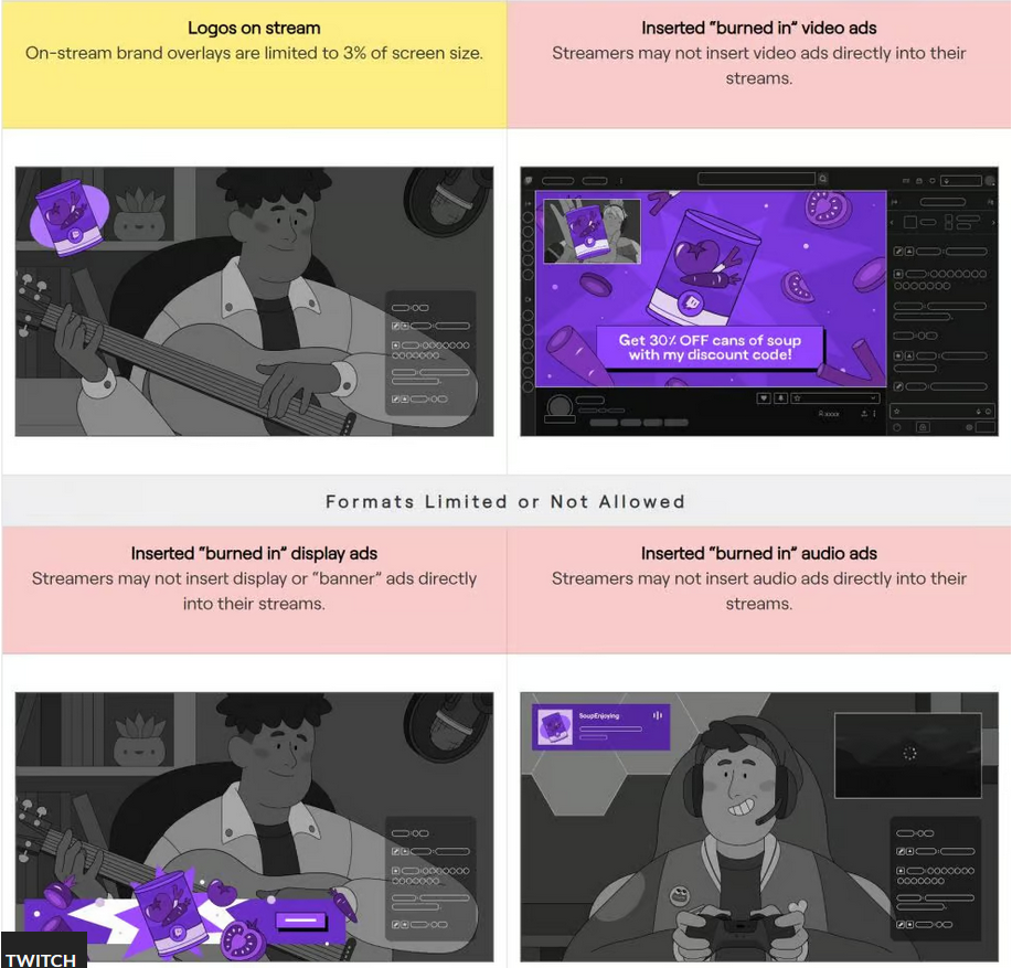 Branded content refers to paid product placements, endorsements, or sponsorships. The update imposes limitations on the size and methods of advertising for streamers. The accompanying image outlines the specific restrictions.