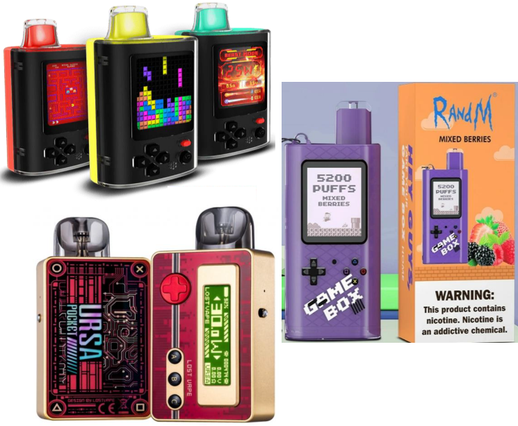 As shown in the figure below, vaping devices now include features such as a fighter jet shooter game, a Pac-Man-type game, and a Tetris-style puzzle. Some devices even feature online casino games, virtual pets that users can feed with food earned by vaping, and puff-count competitions.