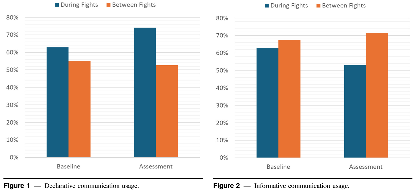 • During team fights, declarative communication significantly increased, while informative dropped. This was also the case when comparing before and after the study intervention.